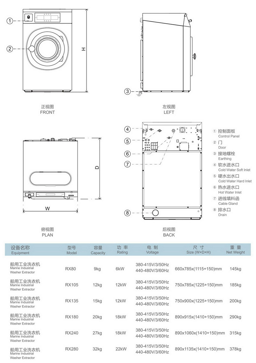 類型: 船用洗衣機 尺寸: 650×710×(1100+150)mm
