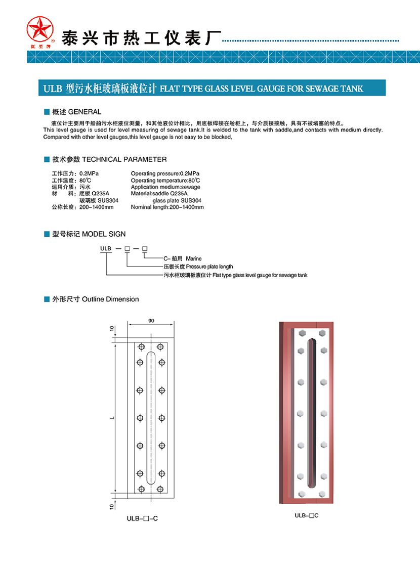| ULB型污水柜玻璃板液位計(jì) | |||