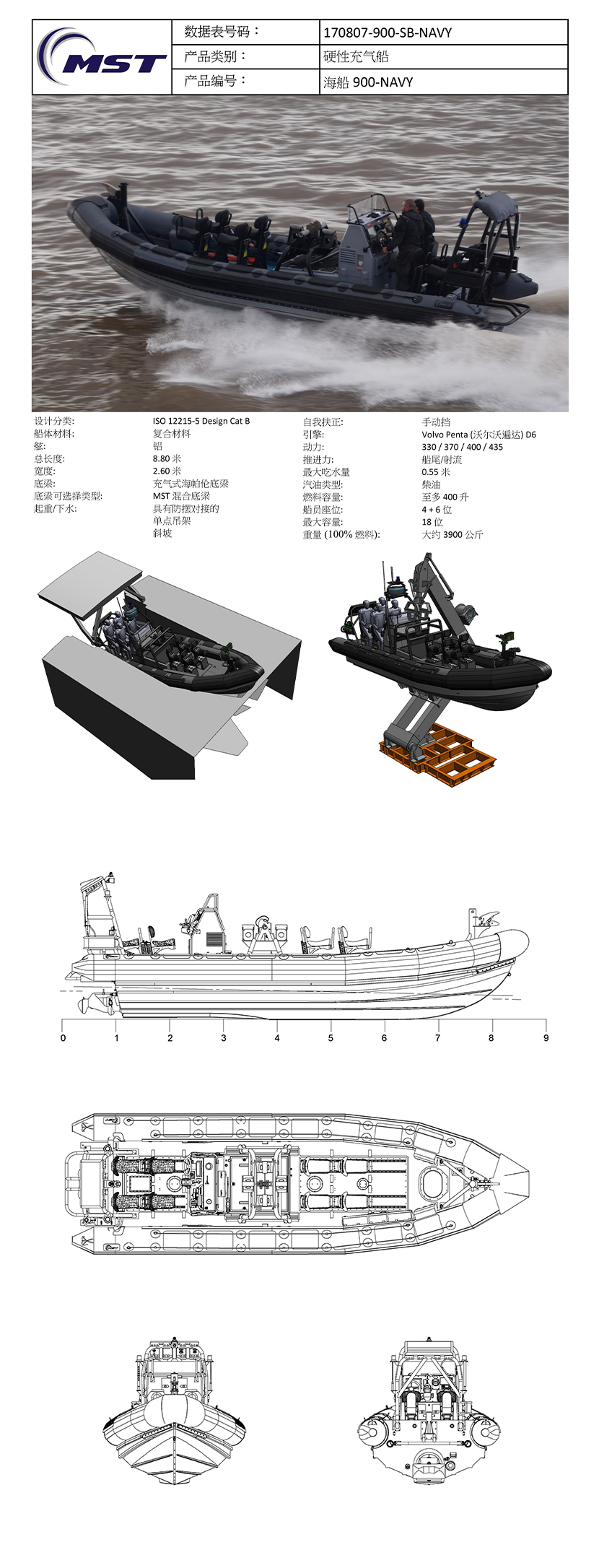 船體材料: 復合材料 總重量: 約3900kg(100%燃料)