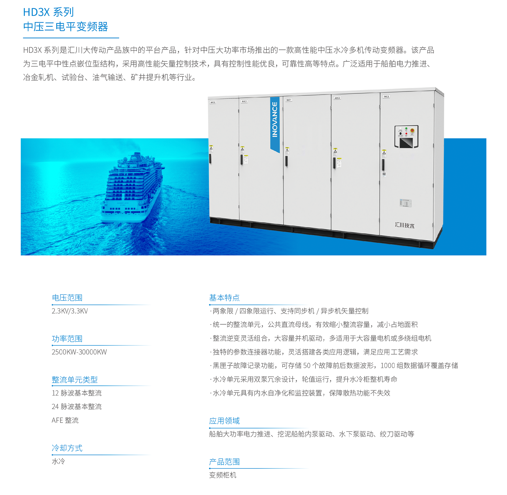 | 應用領域: | 船舶大功率電力推進;挖泥船艙內泵驅動;水下泵驅動;絞刀驅動 | 性能特點: | 兩象限 / 四象限運行;支持同步機 / 異步機矢量控制;縮小整流容量,減小占地面積;整流逆變靈活組合,可大容量并機驅動;故障記錄功能;提升水冷柜整機壽命;保持散熱功能不失效 |