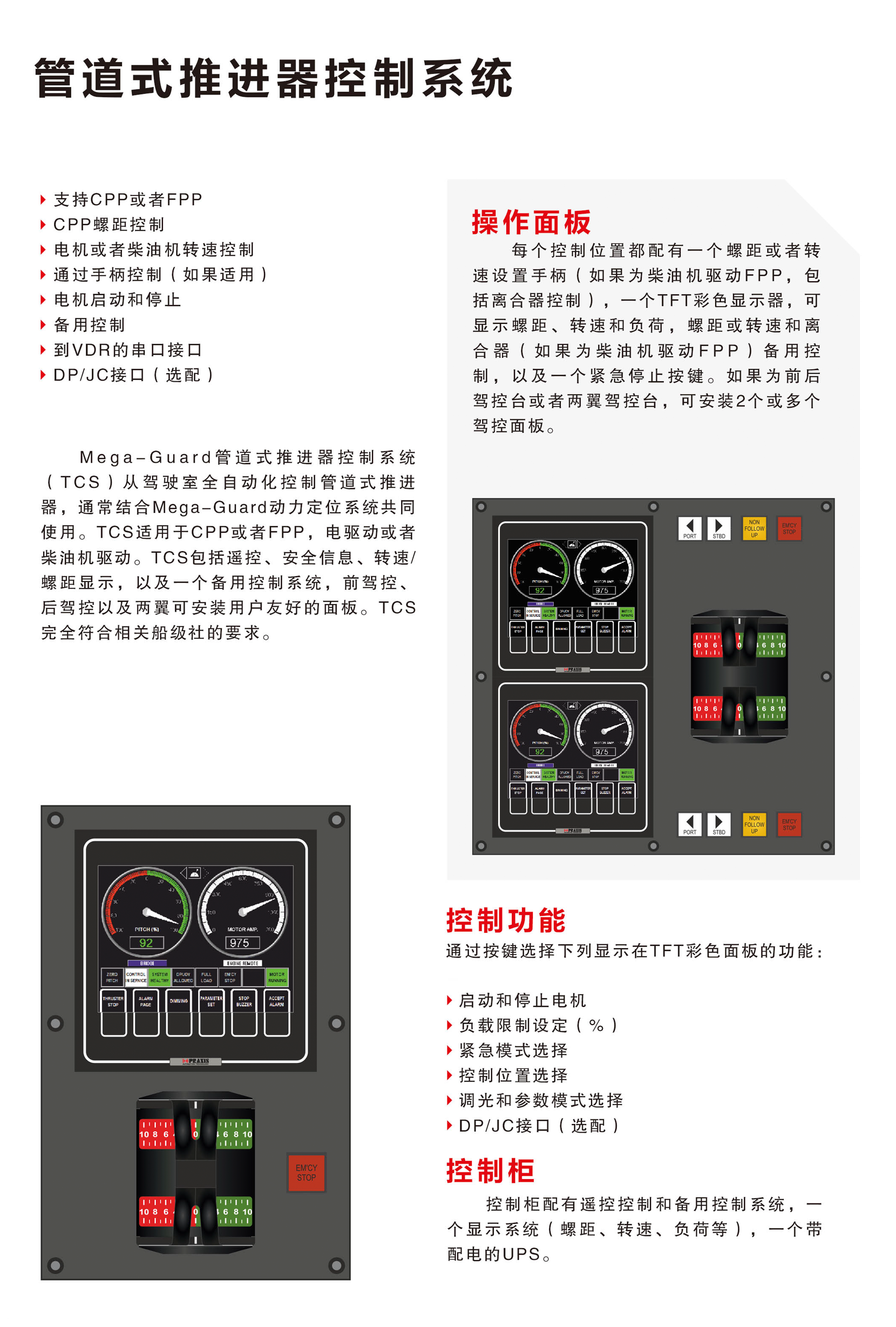 電動機與柴油機均適用;CPP控制螺距;可從駕駛室全自動控制;備用控制;用戶界面友好,易操作